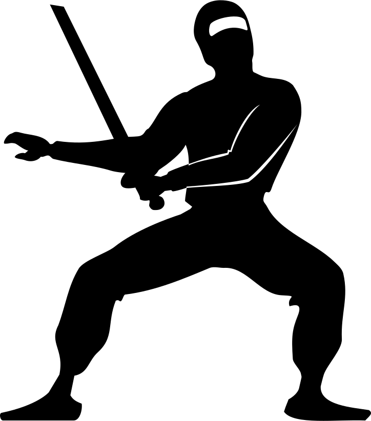 This features a black and white silhouette of a person, possibly a ninja or martial artist, holding a sword in their hand. They are dressed in all black attire, with the exception of their eyes which are visible. The figure appears to be in motion, as if they are performing a stance or preparing for an attack. The silhouette is set against a white background, emphasizing the contrast between the figure and its surroundings.