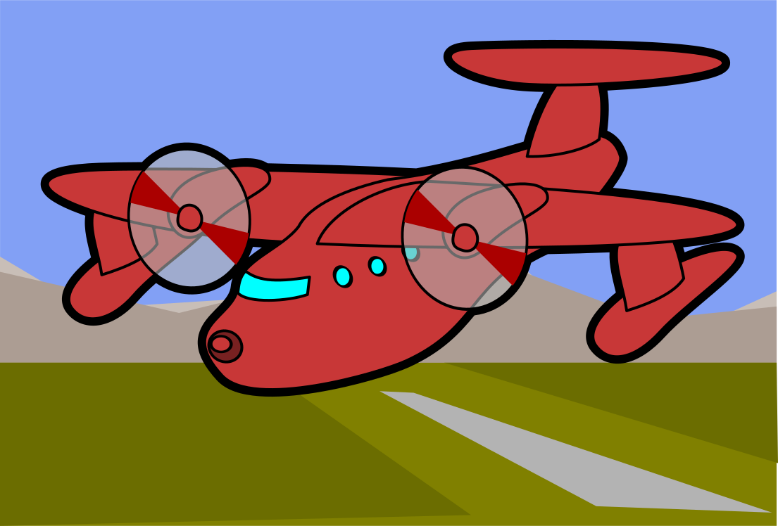 This features a red airplane with two large propellers flying in the sky. It appears to be a cartoon or comic-style illustration, giving it a playful and whimsical appearance. The plane is positioned towards the left side of the frame, occupying most of the space from top to bottom. The propellers are clearly visible on both sides of the airplane, adding to its unique design.