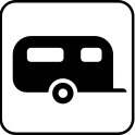 This features a black and white sign with an RV or camper symbol on it. This could be a representation of a recreational vehicle, such as a trailer home or motorhome. The sign is likely used to indicate the availability of camping facilities in the area, possibly at a park or other outdoor location. The simplicity and contrast between black and white make this image visually appealing and easy to understand for those who may be unfamiliar with the symbol.