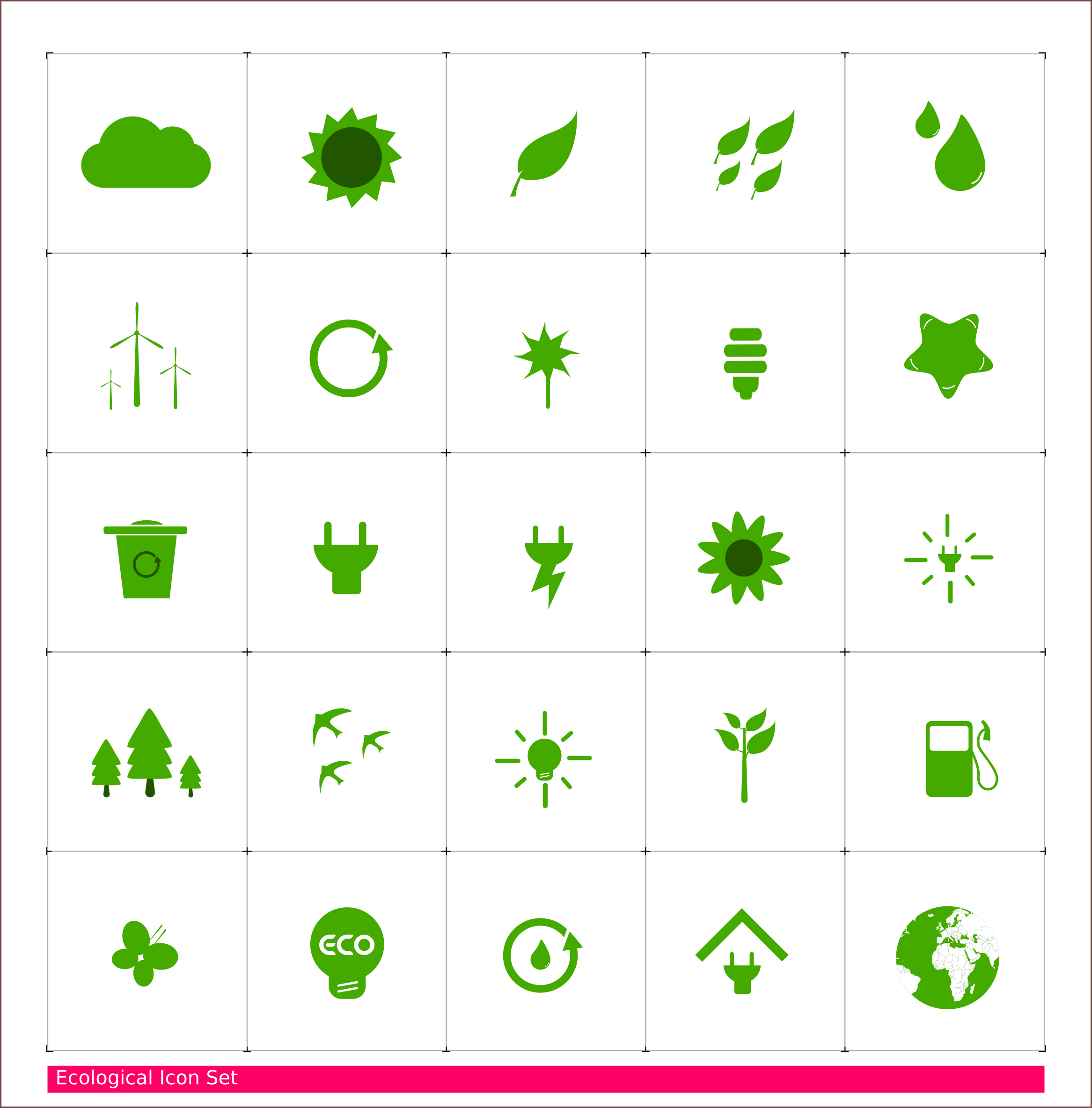 This displays a collection of twenty-five green icons arranged in a 5x5 square. These eco friendly icons are designed to represent various environmental themes, such as windmills, solar panels, and recycling bins. Each icon is uniquely shaped and colored, making the display visually appealing and informative. The icons are organized neatly in a grid pattern, allowing for easy identification of each individual symbol. Overall, this image showcases an eco-conscious approach to designing visual elements that promote environmental awareness and sustainability.