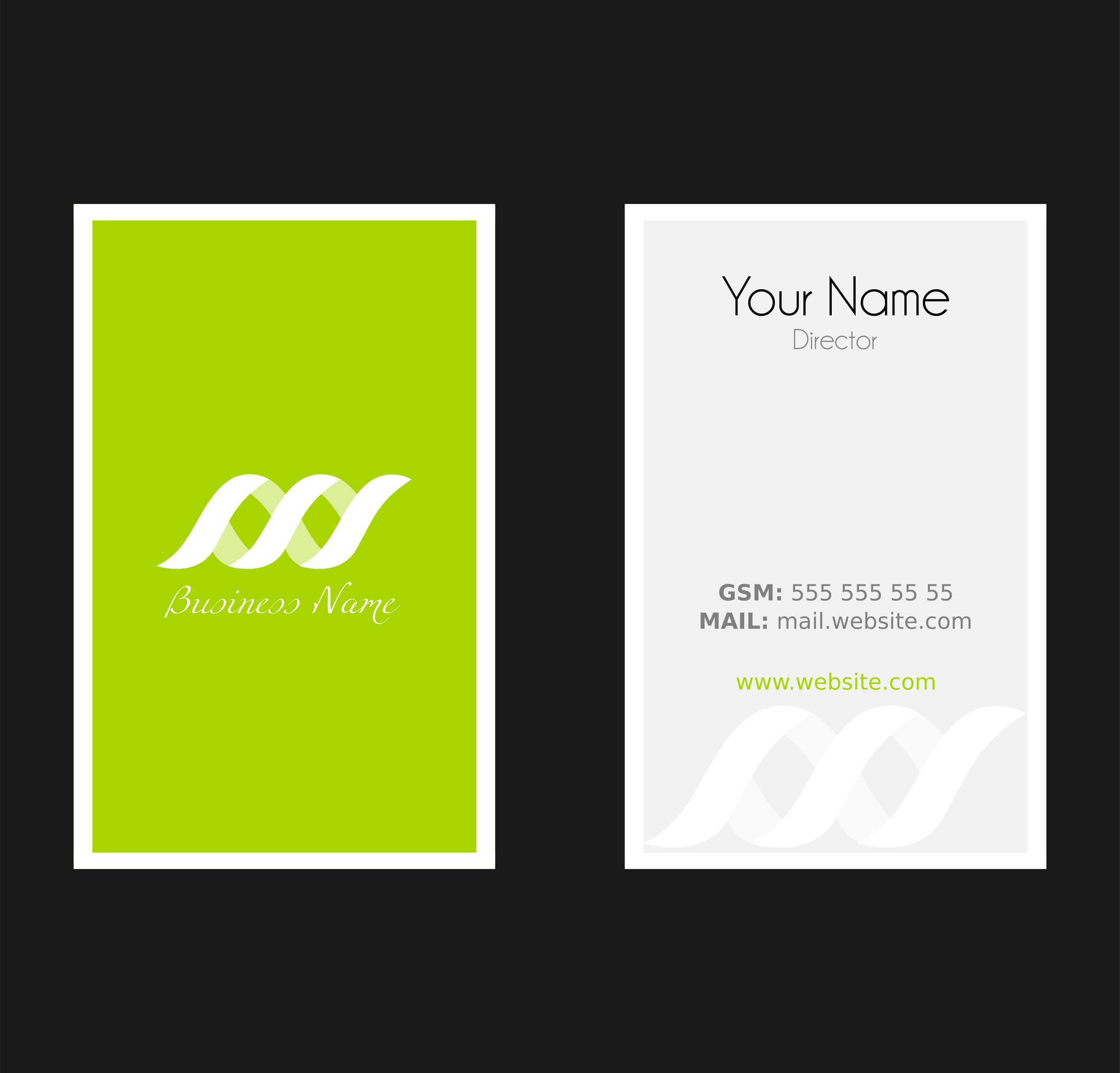 This features two cards, one on the left and another on the right side. Both cards are green in color with white text on them. They have a professional appearance, likely used for business purposes. The cards are placed against a black background, which helps to emphasize their design and content.