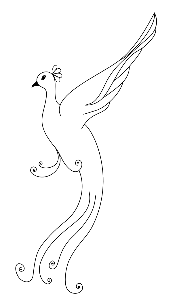 This features a beautifully drawn peacock with an ornate design. It is depicted in black and white, giving it a classic and elegant appearance. The bird's long feathers are prominently displayed, showcasing its majestic wingspan. The peacock appears to be standing on one leg, adding a sense of grace and poise to the image. Overall, this artistic representation captures the essence of the peacock in all its beauty and elegance.