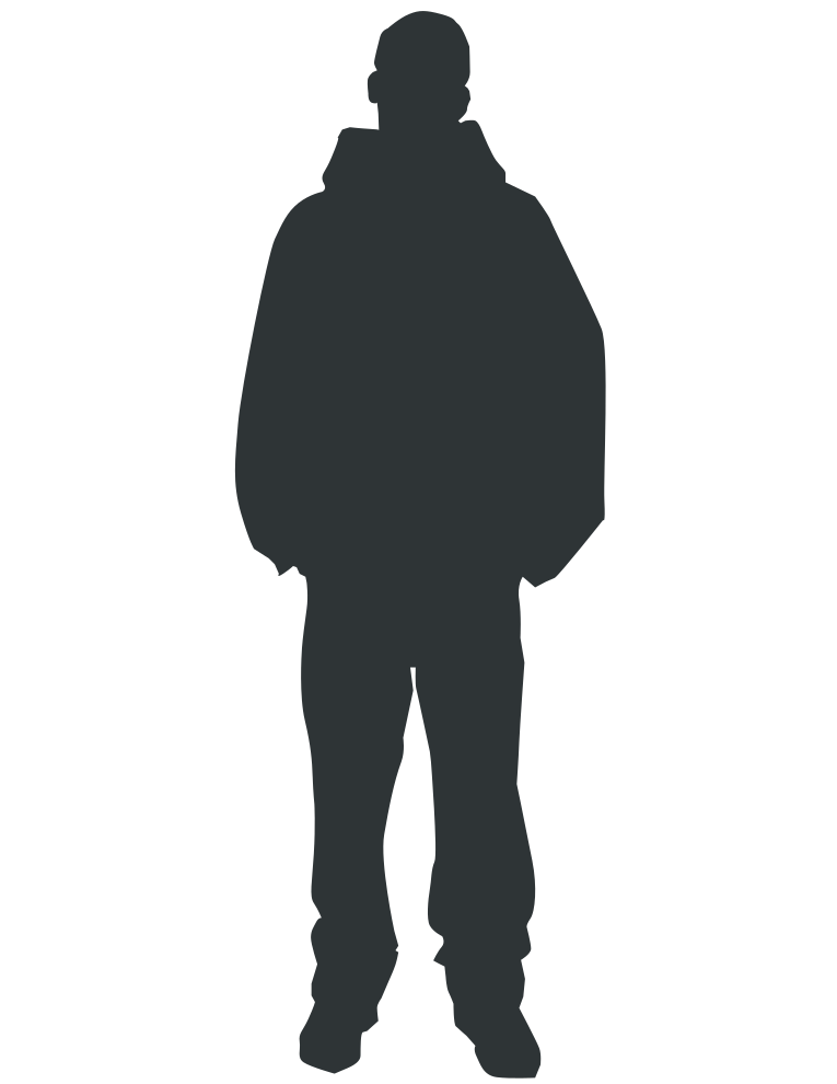This features a silhouette of a person standing in the center, wearing a hooded jacket. The person appears to be looking downward, possibly contemplating or observing something. The outfit is predominantly black and white, giving it an artistic and timeless appearance. The overall scene evokes a sense of mystery and introspection as the viewer tries to discern more about the individual's thoughts or emotions from their posture and clothing.