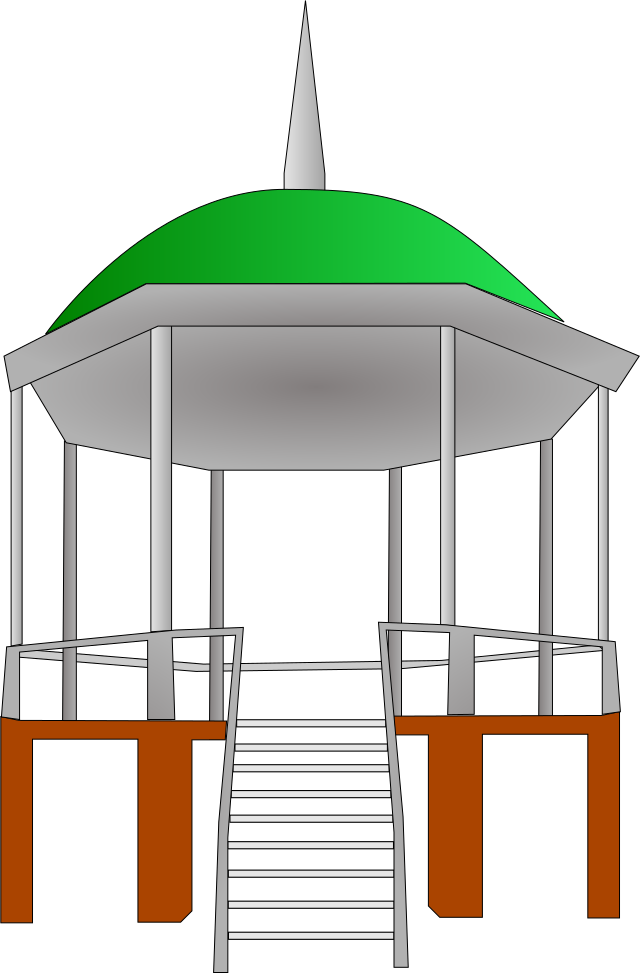 This features a small, open-air pavilion with a green roof. It has a staircase leading up to the top of the structure, and there is an umbrella on top of it. The pavilion appears to be made of wood and metal, giving it a unique and charming appearance. The overall design suggests that this could be a place for relaxation or social gatherings in an outdoor setting.