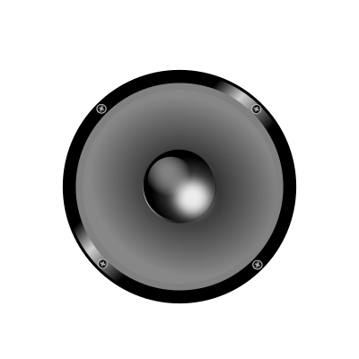 This features a large speaker with a black and silver color scheme. It is round in shape, and the top of the speaker has a metal ring around it. Inside the speaker, there are two small circles visible, one near the center and another towards the bottom right side. This design gives the impression that the speaker is an old-fashioned model, possibly used for amplifying sound or playing music. The overall appearance of the speaker suggests that it may be a vintage item or a collector's piece.