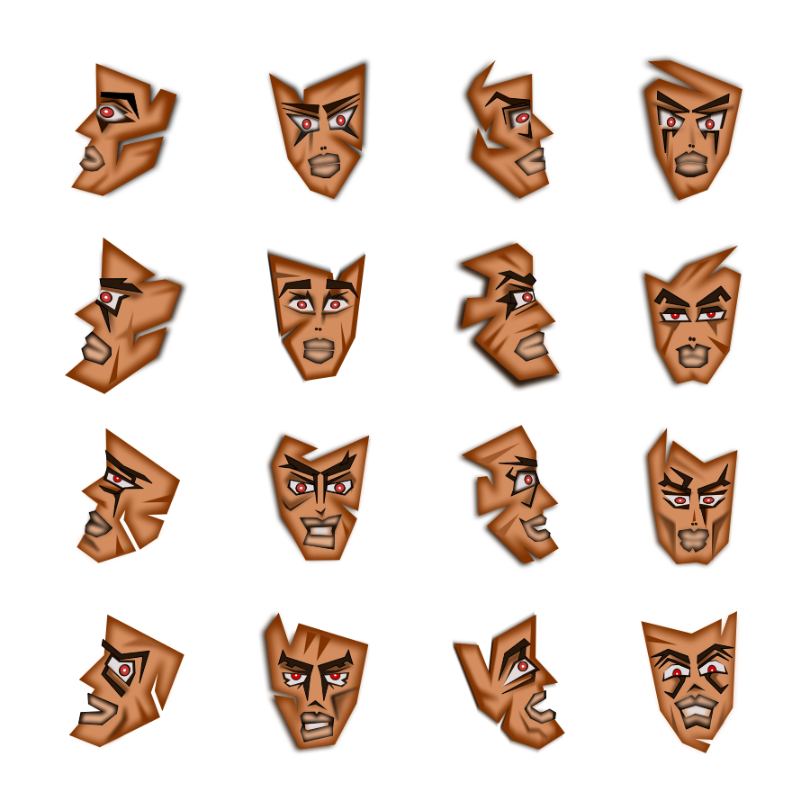 This features a collection of sixteen wooden faces, each with different expressions. These faces are all brown in color and vary in their facial features. Some of the faces have eyes open while others have them closed, showcasing a range of emotions from anger to surprise. The arrangement of these faces creates an interesting visual display that captures the viewer's attention.
