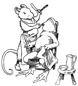This features a mouse shaving the face of a frog who is sitting in a chair. The mouse is holding a pair of scissors, skillfully cutting the frog's whiskers. In addition to the main scene, there are two other objects present: a pitcher and bowl placed on a small stool next to the frog, and another cup located further away from the main action. The illustration is in black and white, adding an artistic touch to the scene.