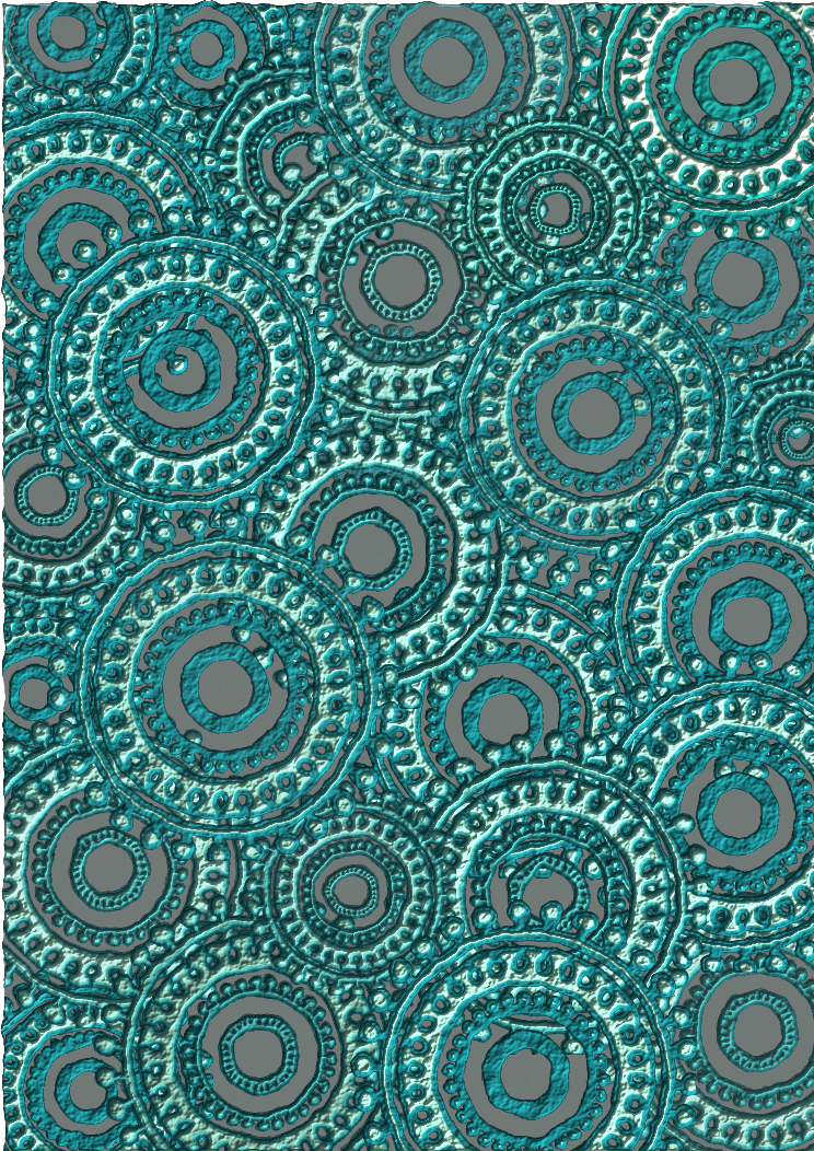 This features a blue and green patterned design with many circles of varying sizes. These circles are arranged in an intricate manner, creating a visually appealing and unique pattern. The color scheme consists of shades of blue and green, which complement each other well. This design could be used for various purposes such as card making or scrapbooking, providing a creative and eye-catching background that stands out from the rest.