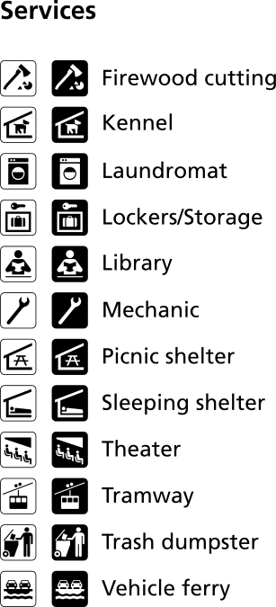 This displays a list of various services available at the national park. These services include camping, picnic shelter, sleeping shelter, trash dumpster, vehicle ferry, and laundromat. Each service is represented by an icon or symbol, making it easy for visitors to identify what amenities are offered in the area. The icons are arranged in a row, with each one clearly labeled for easy recognition. This list of services provides valuable information for park visitors who may need assistance during their stay at the national park.