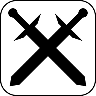 This features a square with two black swords crossed in the middle. These swords are positioned diagonally, creating an X shape within the square. The overall design of the image is simple and bold, making it visually striking. This symbol could be used to represent strength or courage, as the crossed swords often signify a powerful and unyielding stance.