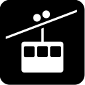 This features a black and white symbol of an empty ski lift. It is a simple design with the main focus on the chairlift, which has no passengers. The chairlift is depicted as being in motion, indicating that it is either ascending or descending the mountain. This symbol could be used to represent various ski resorts or winter sports facilities where such lifts are common.