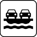 This features a sign with two cars on it, one positioned above the other. Both cars are driving across a body of water, possibly a river or a lake. The scene is depicted in black and white, giving it an artistic touch. The sign appears to be a symbol for transportation or traveling, indicating that the image might represent a journey or a mode of transportation.