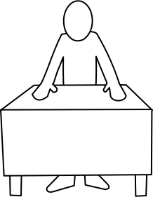 This features a person sitting at a table, possibly in an office setting. The individual appears to be engaged in conversation or working on something at the desk. The scene is depicted with a simple drawing of a man and a chair, giving it a minimalist appearance. The focus of the image is on the interaction between the person and the table, creating a sense of depth and engagement.