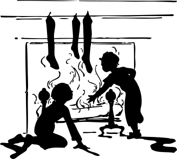 This features a black and white drawing of two children sitting in front of a fireplace. They are positioned close to each other, with one child on the left side and the other on the right. Above them, there is a mantle with stockings hanging for Christmas. In addition to the children, there is another person standing near the fireplace, possibly observing or engaging in conversation. The scene appears to be set during the holiday season, as evidenced by the presence of the stockings and the warmth of the fireplace.