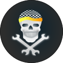 This features a skull and crossbones symbol, which is often associated with danger or warning. However, in this case, the skull has been altered to include a yellow headband around its neck, giving it a playful twist. Surrounding the skull are several wrenches, adding an element of mechanical interest to the design. The combination of the skull and wrenches creates a unique and eye-catching illustration that can be used in various contexts, such as sports or automotive themes.