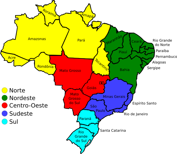 This is a colorful map of Brazil, showcasing its various states and regions. Each state is colored differently to represent the different areas within the country. The map is labeled with the names of each region, making it easy for viewers to identify them. The legend at the bottom of the map provides additional information about the colors used to represent the different regions. This detailed map offers a clear visual representation of Brazil's geographical layout and its diverse states.