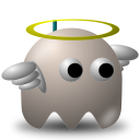 This features a cute and colorful cartoon character, resembling Pac-Man's arch enemy. This character is depicted with an angelic appearance, wearing a halo above its head. It has large eyes and a smiley face, giving it a friendly and approachable look. The character appears to be standing in the foreground of the image, occupying most of the frame.