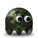 This features a camouflage-patterned Pac-Man character, which is an iconic video game character. This particular version of the character has two large eyes and a mouth, giving it a unique appearance compared to the traditional Pac-Man design. The green background adds to the overall visual appeal of the character, making it stand out even more. The combination of the camouflage pattern and the oversized eyes gives this Pac-Man character a distinctive look that is both eye-catching and memorable.