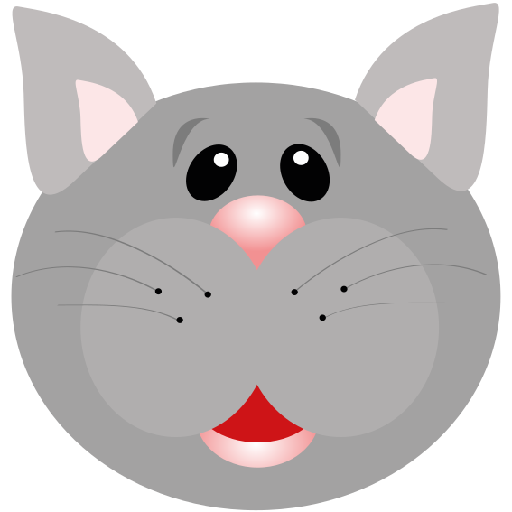 This features a cute cartoon cat with big, round eyes and a pink nose. It has a gray color scheme and is wearing a red mouth, giving it an adorable appearance. The cat's whiskers are also visible, adding to its playful charm. This delightful character appears to be smiling at the viewer, making it an appealing and friendly image.