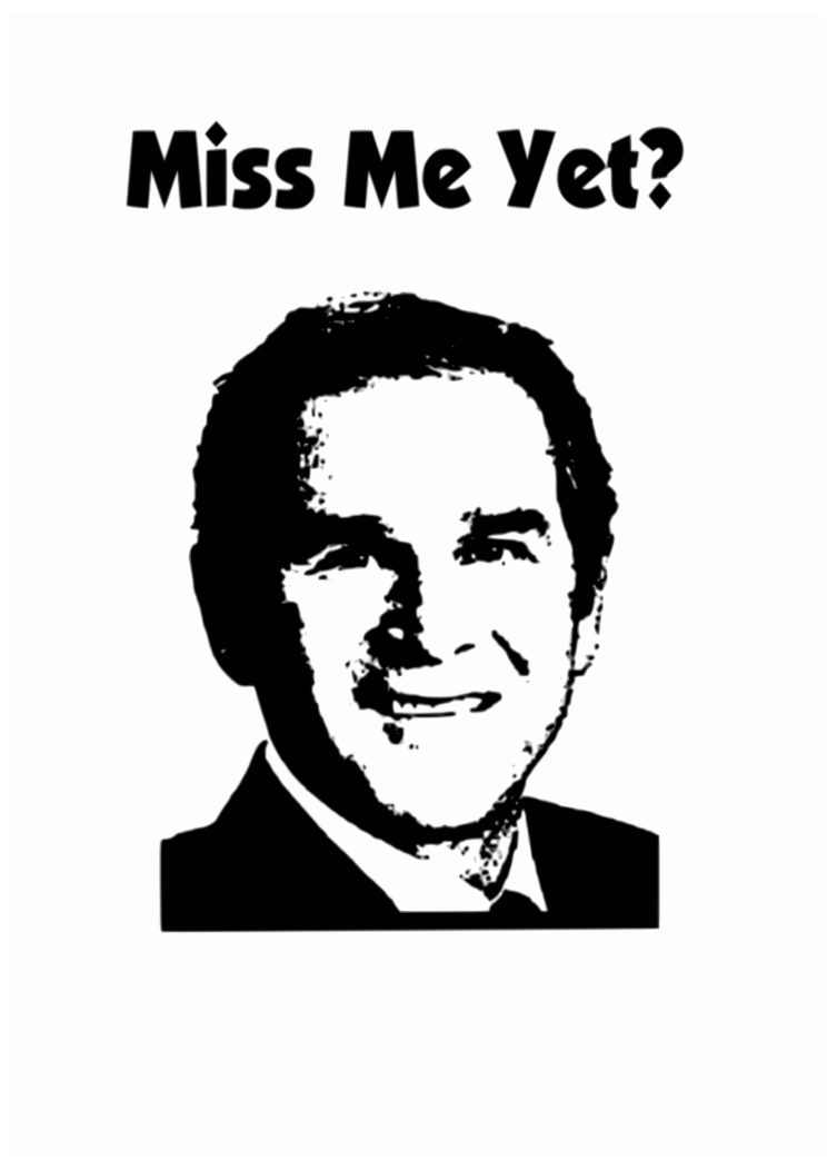 This features a black and white photo of George W. Bush, the 43rd President of the United States. He is wearing a suit and tie, giving off an impression of professionalism. The picture has been edited to include a speech bubble with the words "Miss Me Yet?" written in it, which implies that people might be missing him or expressing nostalgia for his time as president. This image could be used for various purposes such as political commentary, humor, or even as a tribute to George W. Bush's presidency.