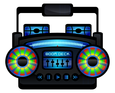 This features a black boom box with two colorful speakers on it. The middle of the boom box displays the words "boom deck," indicating that this is likely an old-fashioned radio or music player. Above the boom box, there is a handle for easy transportation and storage. The design of the boom box gives it a retro feel, reminiscent of the classic radios from past decades.