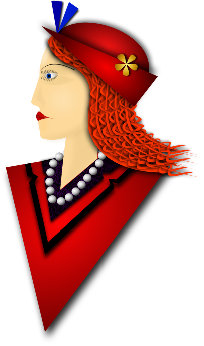 This features a woman wearing a red outfit and a pearl necklace. She is adorned with a red hat that has a yellow flower on it, along with a blue ribbon. Her hair appears to be in a wild state, giving her an untamed look. The overall appearance of the woman suggests she might be from a bygone era or perhaps inspired by vintage fashion.