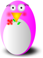 This features a pink and white stuffed animal, which appears to be a bird or a bunny. It is holding a red flower in its mouth, giving it a cute and playful appearance. The background of the image is blurry, focusing attention on the main subject. This charming character could be used as a decoration or a gift for someone special.