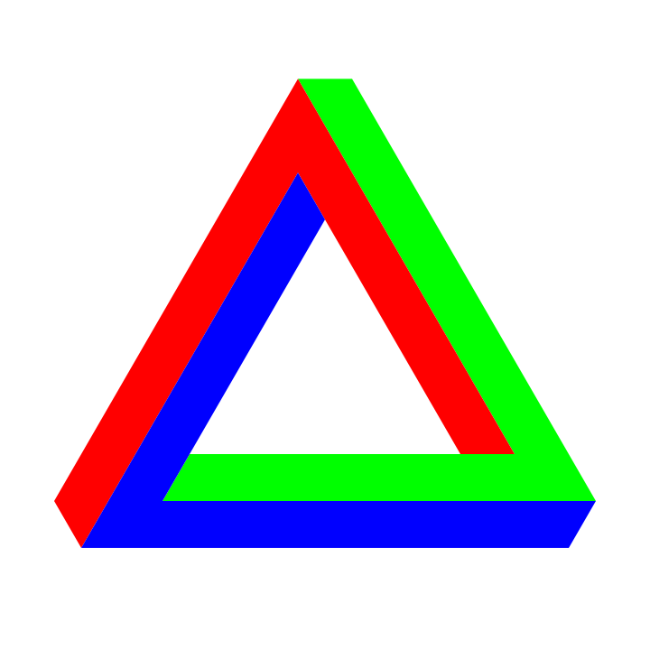 This features a four-sided, colorful triangle with each side having different colors. The triangle is made up of red, blue, green, and yellow colors, creating an eye-catching and vibrant display. This unique design could be reminiscent of the Penrose Triangle, which is known for its intricate patterns and symmetry. The combination of these four distinct colors creates a visually striking pattern that captures attention and adds interest to any space it occupies.
