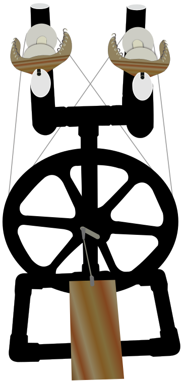 This features a large wooden spinning wheel with two seats, one on each side. It is an old-fashioned design and appears to be made of wood. The wheel has a handlebar attached to it, which allows for easy turning. There are also two small figures sitting in the seats, possibly representing people using the spinning wheel. This unique piece of furniture adds a touch of nostalgia and charm to any room where it is placed.