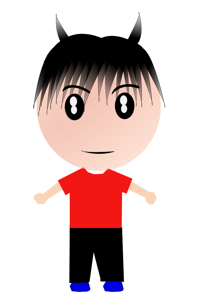 This features a cartoon character with a red shirt and black pants. The character has a mean expression on its face, giving it an evil appearance. It is standing in front of a white background, which provides a clean and uncluttered backdrop for the character. The design of this cartoon figure appears to be inspired by popular culture, as it resembles a demon or a devil-like creature. Overall, the image presents a unique and intriguing visual that captures the viewer's attention with its striking appearance.
