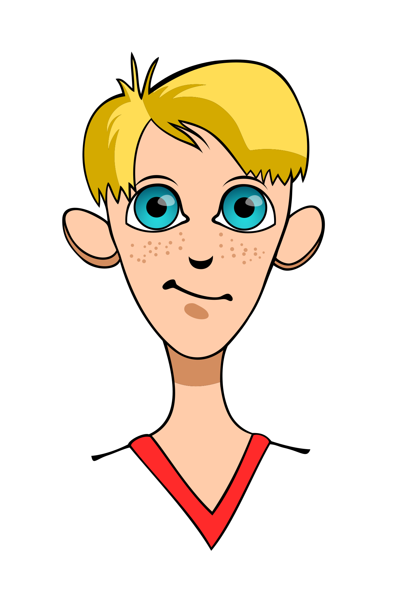 This features a cartoon drawing of a young boy with red hair and freckles. He has a smirk on his face, giving the impression that he is making a funny or sarcastic comment. His eyes are wide open, adding to the playful nature of the scene. The boy's facial expression suggests that he might be teasing someone or simply enjoying himself in this lighthearted moment.