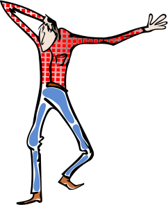 This features a man wearing a plaid shirt and blue jeans, with his arms outstretched. He appears to be dancing or performing some kind of action in the air. The man's shirt is red and white checkered, adding a playful touch to the scene. The drawing itself has a cartoon-like quality, giving it an artistic and whimsical appearance.