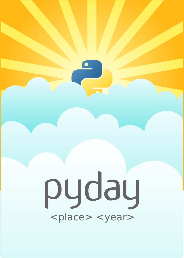 This features a bright and colorful sun with a snake on top of it, symbolizing the Python programming language. This logo is prominently displayed in the center of the scene. Surrounding the sun are several clouds that add to the vibrant atmosphere. In addition to the main logo, there is also a smaller logo for Pyday placed towards the bottom right corner of the image. The combination of these logos and the bright colors create an eye-catching and memorable visual representation of Python programming.