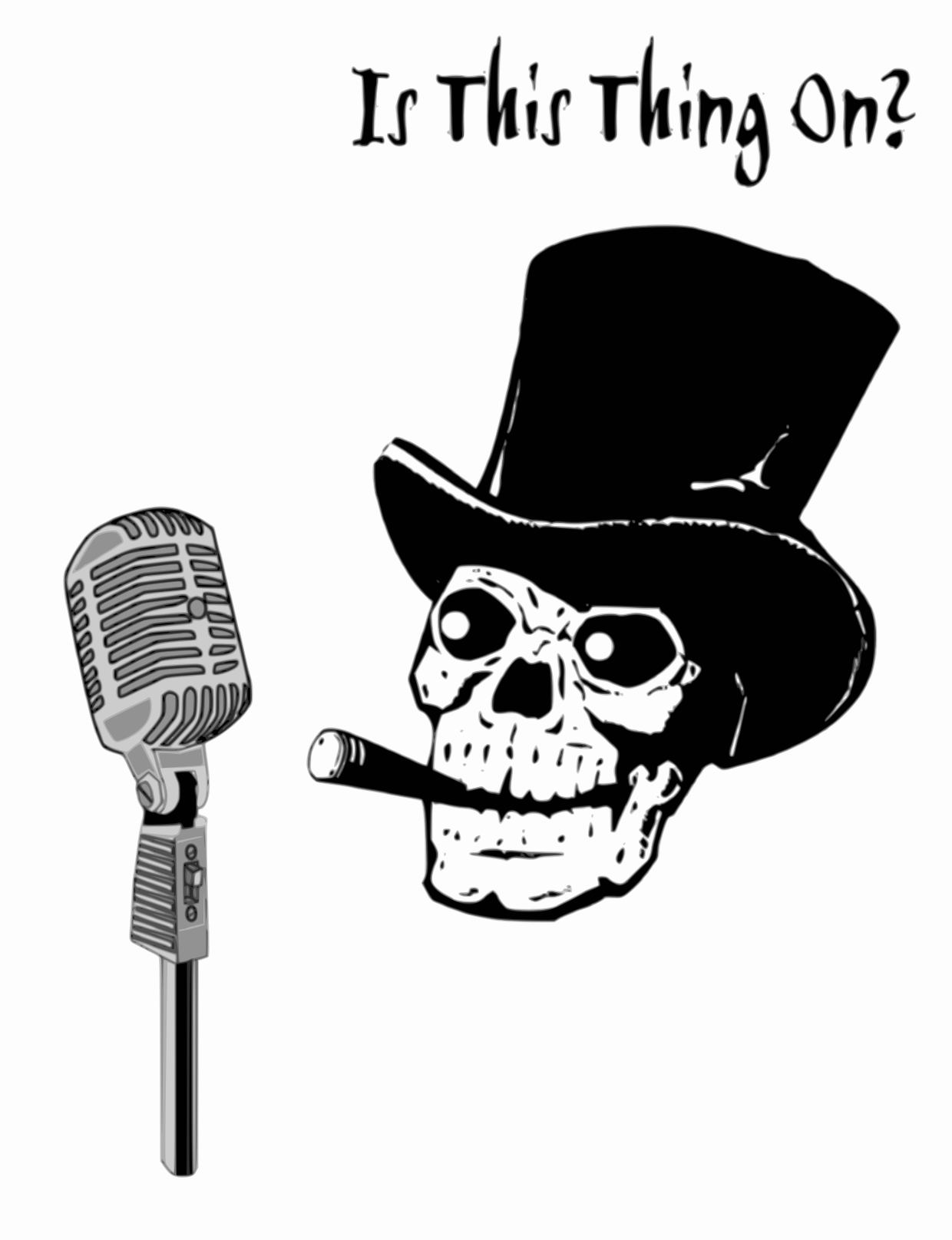 Tags: announcer, b&w, clip art, clipart, humor, music, skeleton, skull, slogan, hat, microphone