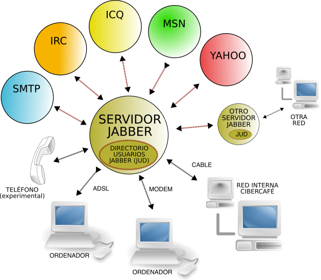 This depicts a diagram that illustrates the relationship between various technologies and concepts. In the center of the diagram, there is an icon labeled "servidor jabber," which represents a server for Jabber Direct Message (JDM). Surrounding this central icon are several other icons representing different aspects of technology and communication. One notable icon is that of a telephone, indicating the presence of voice communication in the diagram. Other icons include those for internet protocols such as TCP/IP and HTTP, as well as symbols for data storage like hard drives and USB devices. Additionally, there are icons representing various software applications, including Microsoft Office and Adobe Photoshop. The image also features a few computer monitors placed around the central icon, further emphasizing the connection between these technologies and concepts. Overall, this diagram provides an overview of the interconnectedness of modern communication and technology.