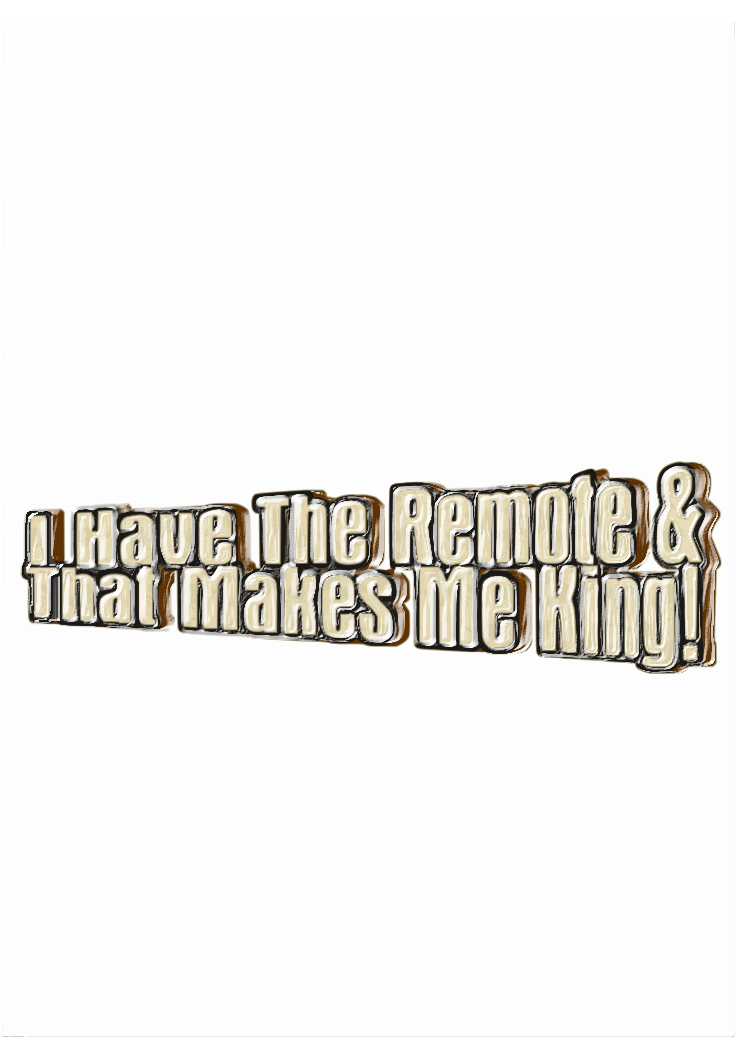 This is a white background with the words "I have the remote & that makes me king!" written in gold letters. The text design gives an impression of being three-dimensional, making it stand out from the plain white background. This phrase suggests that whoever owns the remote control has some authority or power over others, as they can control what is played on the television.