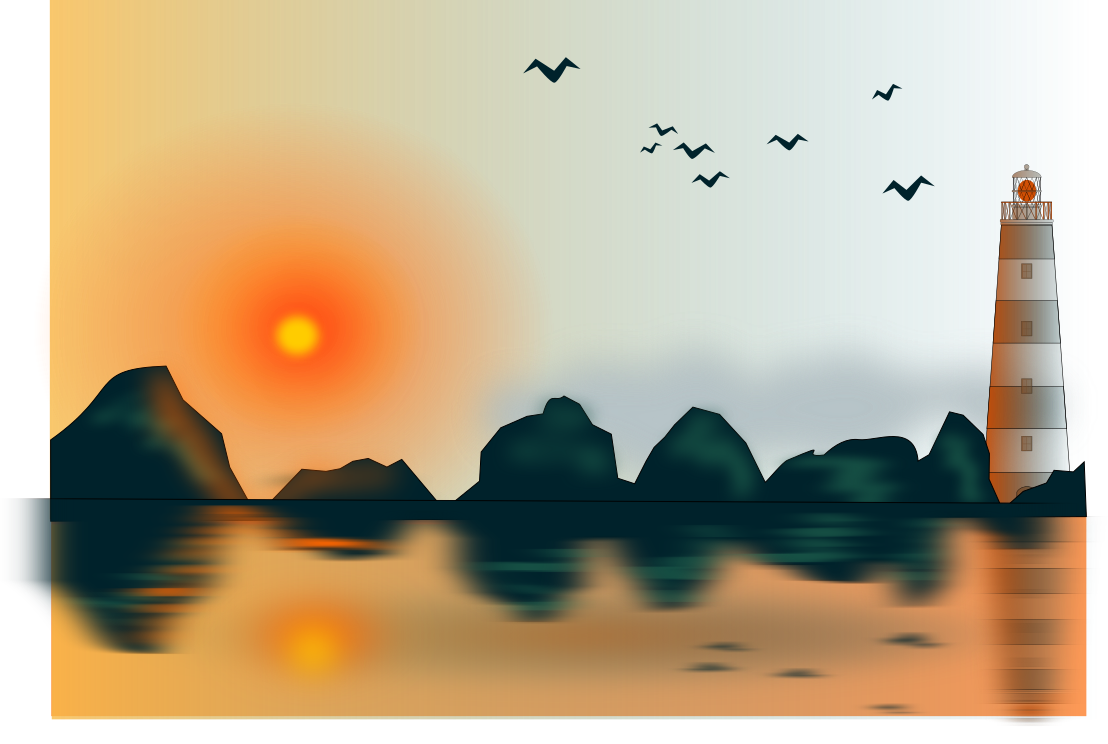 This features a beautiful sunset over the ocean, with a lighthouse towering in the background. The sky is filled with birds flying around, creating a serene and picturesque scene. There are at least 13 birds visible in various positions across the sky, some closer to the lighthouse while others fly further away. The sunset casts warm hues over the ocean, making it an ideal setting for this peaceful moment.