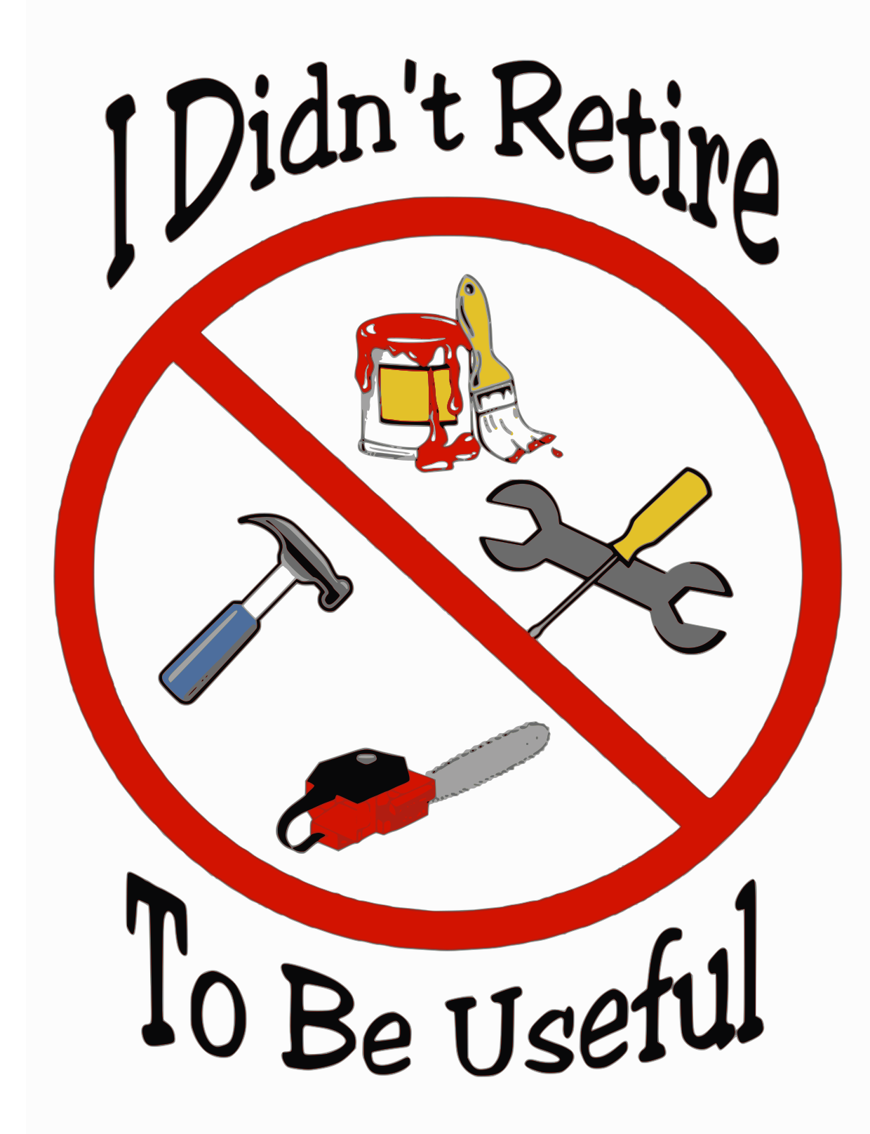 This features a red and white sign with various tools on it, including a hammer, wrenches, scissors, and a pair of pliers. These tools are placed around the edges of the sign to create an interesting visual effect. The sign is accompanied by a caption that reads "I Didn't Retire To Be Useful." This phrase suggests that the person who created this design might be expressing their desire to continue being useful and engaged in life, even after retirement.