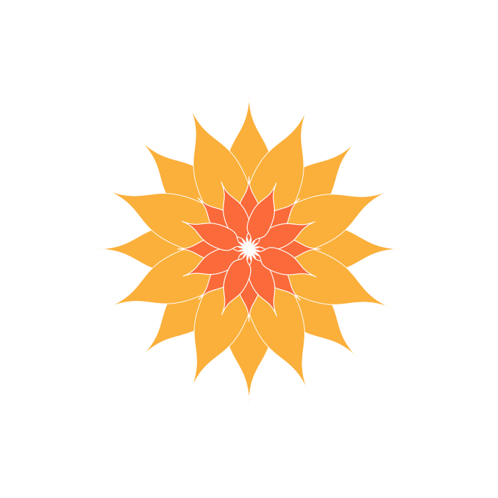 This features a yellow and orange sunflower with a center that is shining brightly. The flower has a circular shape, giving it an appealing appearance. The vibrant colors of the sunflower make it stand out against the white background, creating a visually striking contrast. This artistic design could be used for various purposes such as wall decorations or even as part of a logo.