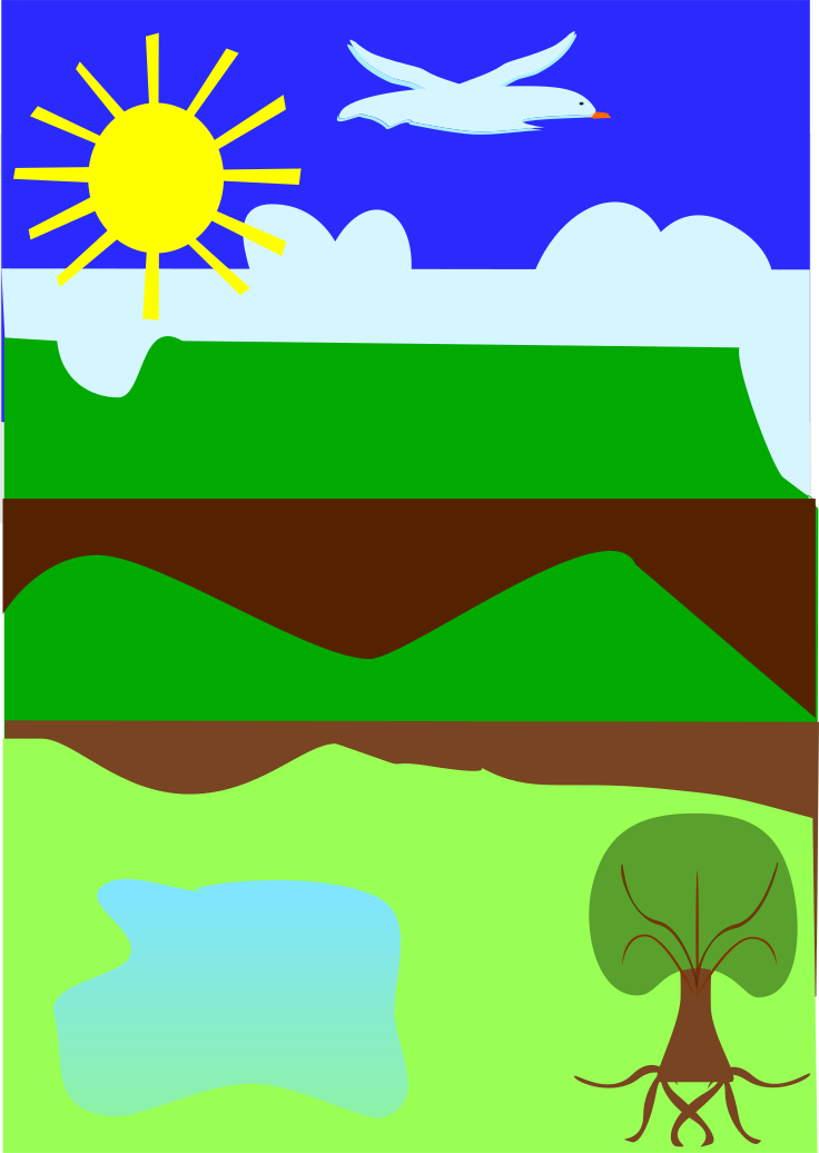 This features a beautiful landscape with a variety of elements. In the foreground, there is an illustration of a tree with its roots exposed, giving it a unique appearance. Above this tree, a bird can be seen flying in the sky, adding to the overall charm of the scene. In addition to these main features, the image also includes a sun and clouds, which contribute to the natural atmosphere of the landscape. The sun is positioned towards the left side of the image, while the clouds are scattered throughout the background. Overall, this artistic representation captures the essence of nature and its beauty.
