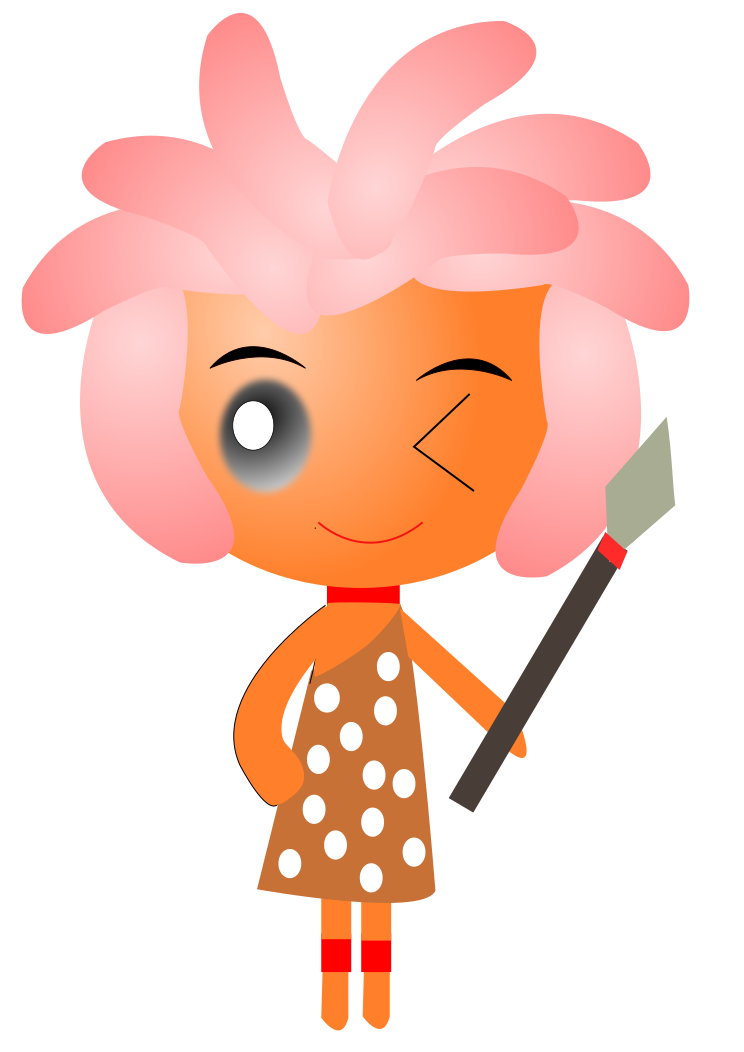 This features a cartoon character with pink hair, wearing a polka dot dress and holding a paintbrush. The character appears to be smiling as it poses for the picture. The background is white, providing a clean and simple backdrop for the colorful character. This whimsical illustration could be used in various contexts such as advertising or artistic projects.