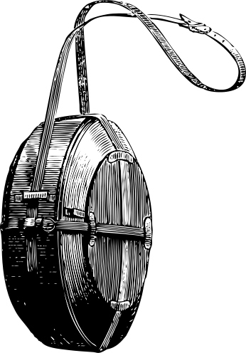 This features a black and white drawing of an old-fashioned water canteen. It is depicted as a leather bag with a strap, which is hanging from the top. The design showcases intricate details, giving it a vintage appearance. The canteen appears to be a functional piece that would have been used in earlier times for carrying water during outdoor activities or traveling.