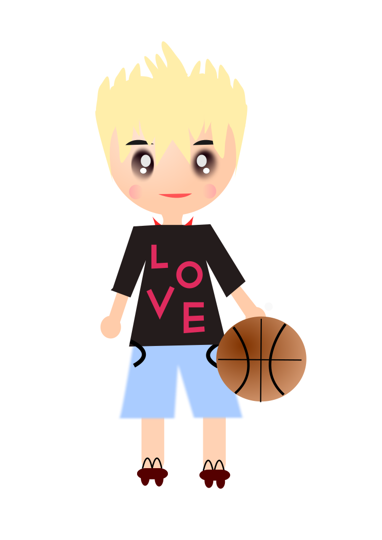 This features a cartoon character, possibly a young boy or a man with blonde hair, wearing a black shirt that says "love" on it. He is holding a basketball in his hand and appears to be posing for the camera. The character's outfit includes blue shorts, which adds a playful touch to the overall appearance. The cartoon style of the image suggests that it could be from a children's book or an animated show.