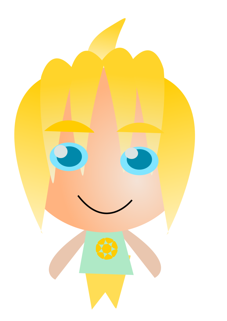 This features a cartoon character with blonde hair, wearing a green dress. This character has a smiling expression and is posing for the camera. The cartoon appears to be a female figure, possibly from a video game or animated series. The character's outfit consists of a green top and yellow hair, giving it a unique and playful appearance.