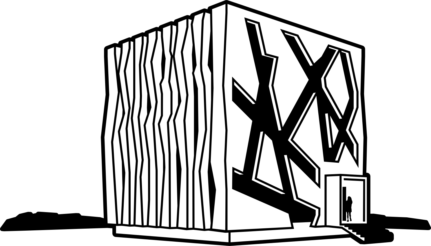 This features a large, black and white box with an open door. Inside the box, there is a person standing in front of a window. The scene appears to be a silhouette drawing or a simple illustration, giving it a minimalist appearance. The box itself has a unique design, possibly resembling a house or a building. Overall, the image conveys a sense of mystery and intrigue with its unusual subject matter and composition.