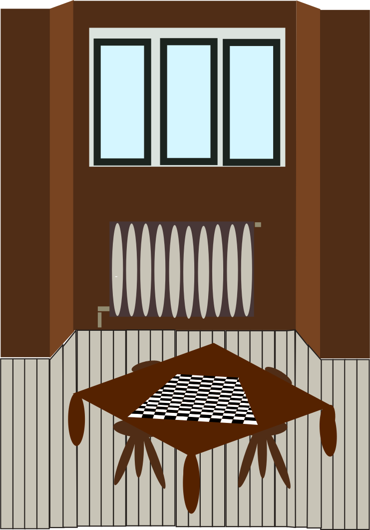 This features a room with a wooden table and chairs. On the table, there is a checkered pattern that resembles a chessboard. Above the table, there are two windows providing natural light to the space. Additionally, there is a radiator in the room, which adds warmth during colder months. The overall atmosphere of the room suggests it could be used for playing chess or other board games.