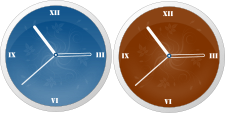 This features two clocks, one blue and the other orange, placed side by side. Both clocks have a similar design with Roman numerals on their faces. The blue clock is positioned towards the left of the scene while the orange clock is located to its right. Each clock has a unique time displayed, with the blue clock showing 10:25 and the orange clock displaying 9:35. The overall composition creates an interesting visual contrast between the two clocks, showcasing their different colors and styles.