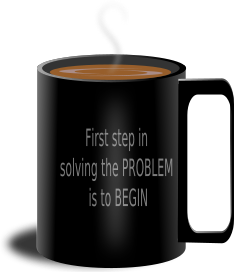 Tags: slogan, black, coffee, cup, first step in solving the problem is to begin