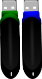 This features two USB flash drives, each with a different color. One of the flash drives is blue and green, while the other one is black. They are both attached to a computer using cords, making them easily accessible for use. These flash drives can be used to store and transfer data between devices, providing an efficient way to manage files and documents. The variety in colors makes it easy to identify each drive when needed, ensuring that the correct one is being used for specific tasks or purposes.