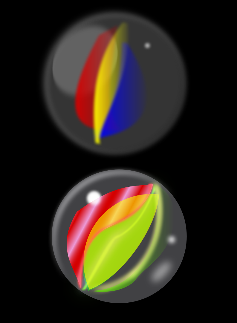 This features two round objects with a similar design, each containing a colorful leaf. One of the objects is placed on top of a black background, while the other is positioned in front of it. These two items are likely marbles or glass balls, as they share a common shape and design. The colors used for the leaves are vibrant and eye-catching, making them stand out against their dark surroundings.